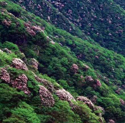 百里杜鵑林帶呈環(huán)狀分布,延綿50余公里,寬約1~3公里。有馬纓杜鵑、大白花杜鵑、水紅杜鵑、露珠杜鵑等41個(gè)品種,占世界杜鵑花5個(gè)亞屬中的全部;ㄉ鄻,絢爛生輝。每年3月中下旬到4月底次第開(kāi)放,百里花山色彩繽紛,猶如廣袤的錦緞華章鋪山蓋嶺,百態(tài)千姿。被譽(yù)為“世界上最大的天然花園”。