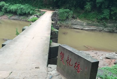 雙龍橋位于丙安鄉(xiāng)丙安村正安組一條河溝入赤水河的河口,始建于清代,面積約120平方米。雙龍橋東西走向,橋長368米,寬1.7米,水面至橋面高3.2米,河中有九礅,礅寬3米,橋面分為九段,每段均為長4米,寬0.85米,厚0.5米的條石鋪砌,中間兩礅鑿有一雌一雄兩條龍昂首向上流方向,龍頭高出橋面1.1米,橋中間另外三墩上有被破壞的雕刻痕跡,據(jù)附近居民講是獅子造型,文革期間被打破丟棄河中,兩端橋長14.4米,東端橋長3米。