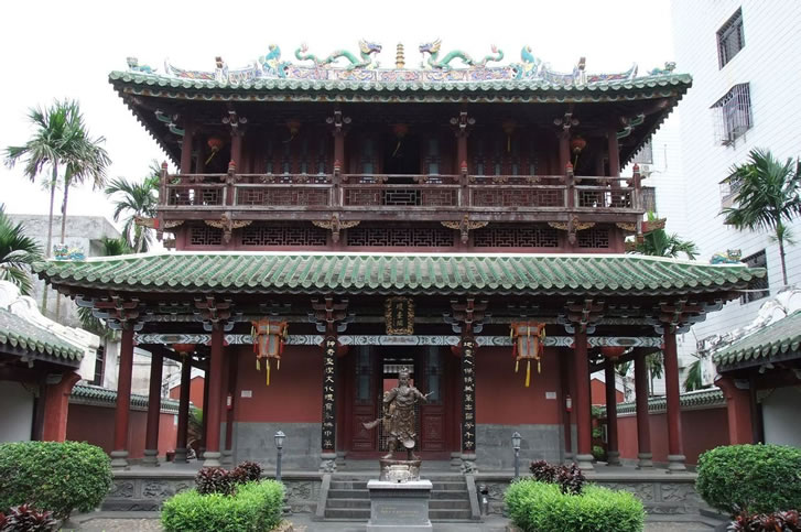 府城鼓樓位于府城鼓樓街,原名譙樓,又稱文明樓。始建于明洪武五年(1372年),明清兩代多次重修。臺基為明成化十七年(1481年)擴建而成,長28米,寬24米,高6.39米。兩拱門,寬4.6米,高7.1米,門額分刻“海南壯觀”、“奇甸文明”,F(xiàn)存鼓樓為清乾隆五十三年(1788年)重修,坐北朝南,面闊五間19.9米,進深三間9.95米,高7.56米,歇山頂,脊飾二龍朝日。樓內原有明正統(tǒng)元年(1436年)銅禁鐘一口,鐘銘記述了捐資鑄鐘情況及祈求國泰民安之意,現(xiàn)存五公祠。