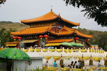 三亞南山寺位于三亞南山文化旅游區(qū)內(nèi),是一座仿盛唐風(fēng)格、居山面海的大型寺院。南山寺是已故中國(guó)佛教協(xié)會(huì)會(huì)長(zhǎng)趙樸初親臨選址,經(jīng)國(guó)家宗教局批準(zhǔn),于1995年11月11日奠基,1998年4月12日建成,F(xiàn)有仿唐建筑仁王殿、天王殿、鐘樓、轉(zhuǎn)輪藏、東西爬山廊、東西配殿、金堂等建筑群,總建筑面積5500㎡。整個(gè)建筑氣勢(shì)恢宏,為中國(guó)近五十年來(lái)新建的最大佛教道場(chǎng),也是中國(guó)南部最大的寺院。自古名寺出高僧,南山寺的方丈是86歲高齡的高僧新成大和尚,監(jiān)院是中國(guó)佛教協(xié)會(huì)副會(huì)長(zhǎng)明生法師。南山寺第二期工程已啟動(dòng)。按照規(guī)劃設(shè)計(jì),第二期工程遵循古代大型佛教寺院方正劃一、主次分明的特點(diǎn),將主要建筑集在中軸線上,在兩側(cè)設(shè)置12個(gè)不同功能的四合院。二期工程完成后,整個(gè)南山寺東西寬188米,南北長(zhǎng)416米,共8個(gè)臺(tái)階總高差49米,總建筑面積4萬(wàn)平方米。