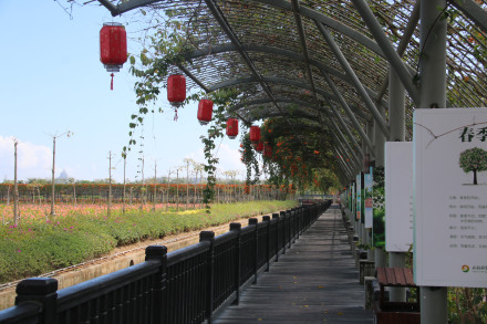 五色長(zhǎng)廊長(zhǎng)達(dá)200米,利用原生態(tài)爬藤類植物打造而成,炮仗花、使君子、百香果長(zhǎng)年環(huán)繞于長(zhǎng)廊頂,四季花開、碩果累累、香飄四溢,長(zhǎng)廊腳基處龍船花爭(zhēng)先斗艷,形成了一座天然文化欣賞景觀。