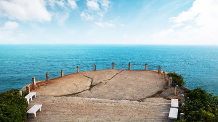 觀日巖位于蜈支洲島的東南懸崖處。站在巖上憑海臨風(fēng),俯瞰全島,遼闊的南海盡收眼底。懸崖下面,怪石嶙峋。 風(fēng)平浪靜之時,乘快艇環(huán)島游,石景千奇百怪,觀日巖像一尊天然大石佛,面向大海,日夜修煉。新世紀(jì)的曙光從這里升起,緋紅的太陽從海面上徐徐上升,形成海天一色的海上觀日點。住島客人若欲觀看日出,可向酒店前臺咨詢?nèi)粘鰰r間。