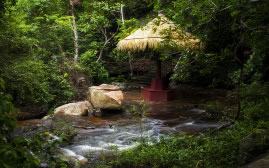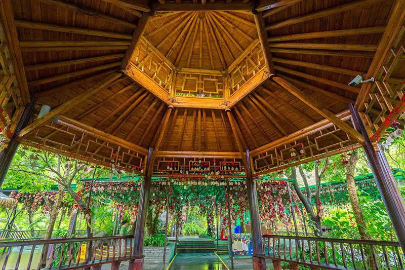 蘭花溪將中國傳統(tǒng)造園技巧與熱帶雨林文化進行結(jié)合,附近有花草、茅草屋、徒步小道,長藤下分布有樹桌椅。