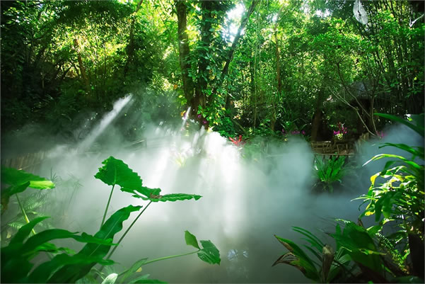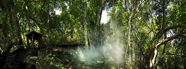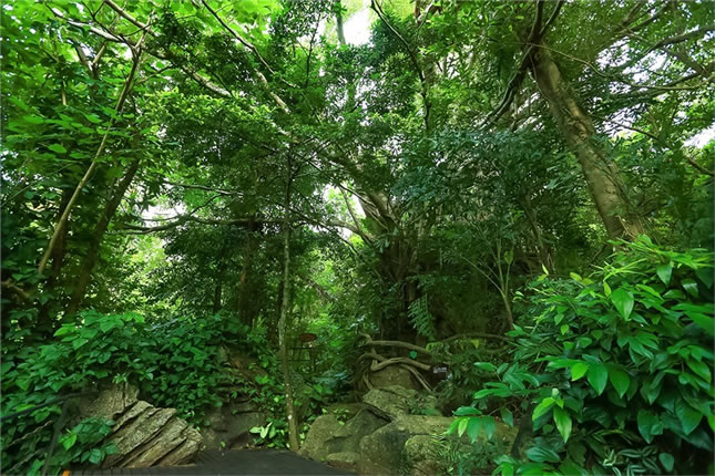 雨林谷以展現(xiàn)原生態(tài)的熱帶雨林景觀為核心,匯集參天巨榕、百年古藤、黑桫欏、仙草靈芝、見血封喉、野生桄榔以及“高板根”“根抱石”“空中花園”“老莖結(jié)果”“植物絞殺”“藤本攀附”熱帶雨林的六大奇觀等。雨林谷是“天然氧吧”和負氧離子發(fā)生器,此地年平均溫度24度。雨林谷游覽通道由木棧道、野趣石階、吊橋組成,長達3.5千米,分為大、中、小三個環(huán)行線路。