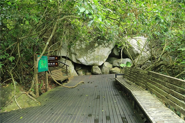 雨林谷的吉祥梯步向上走可見如同巨傘、渾身掛滿紅布條和小木牌的大榕樹,高約四十米,樹齡超過一千年,根系將中間的石頭團團抱住。樹下長著眾多的莆葵和海芋,都被大榕樹伸出的枝條“攬”在懷中,當?shù)厝朔Q其為“峒主神樹”。