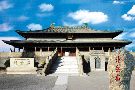 北岳廟,原名“北岳安天元圣帝廟”。位于保定市曲陽(yáng)縣境內(nèi),是漢代和清朝封建皇帝遙祭北岳恒山的地方。北岳廟建于北魏宣武帝年間(500~515年),唐開(kāi)元二十三年(735年)擴(kuò)建。明嘉靖年間(1522~1566年),北岳廟規(guī)模達(dá)到頂峰。清順治十七年(1660年),改祀北岳于山西渾源,曲陽(yáng)北岳廟逐漸荒廢。北岳廟主要建筑平面布局呈“田”字形,長(zhǎng)達(dá)542米、寬321米,坐北朝南排列在一條垂直中軸線上,由南往北依次為登岳橋、神門(mén)、牌坊、朝岳門(mén)、御香亭、凌霄門(mén)、三山門(mén)、飛石殿、德寧之殿、后宅門(mén)、望岳橋。