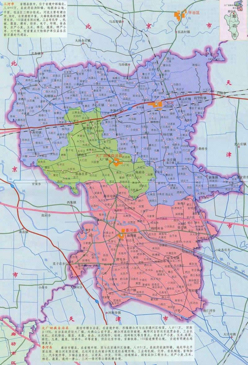 1993年經(jīng)國務(wù)院批準(zhǔn)撤縣設(shè)市,現(xiàn)轄10鎮(zhèn)2區(qū)(燕郊省級(jí)經(jīng)濟(jì)技術(shù)開發(fā)區(qū)、省級(jí)農(nóng)業(yè)高新技術(shù)園區(qū))、2個(gè)街道辦事處、395個(gè)村街。