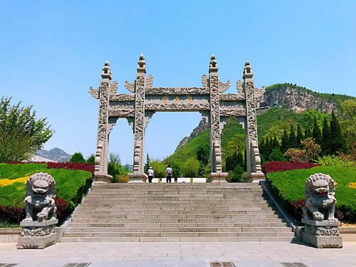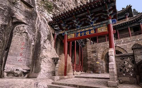 媧皇宮山門,坐東朝西,有三孔磚砌拱門組成。兩邊兒對聯(lián)寫著:鳳山名隆仙島;神仙勢壓十洲。橫批是:蓬壺仙境。進了門是木牌坊,上額書寫“媧皇古跡”。牌坊西是皮瘍廟,塑著皮瘍王和魯班的神像。牌坊東樹一通古牌,上寫《古中皇山》。走過牌坊,東面峭壁上有北齊時的磨崖刻經(jīng)。再往前走是石券門,頂上建鼓樓。券額上刻著“中州勝景”四個大字 。