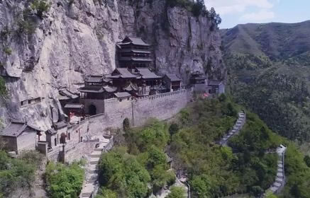 媧皇閣是媧皇官建筑群的主體建筑,它依著山崖峭壁修建,共分為四層。第一層是拜殿,拜殿之上又建了三層樓閣,總高23米。媧皇閣背靠懸崖,用八條鐵索將樓體系在懸崖峭壁之上。素有“吊廟”、“活動樓”之稱。媧皇閣底層為石窟,始建于北齊天保年間(公元550~559年)是媧皇宮最早的建筑之一。