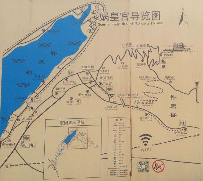 當?shù)赜?個數(shù)字形象地概括了媧皇宮特點:1座吊樓,2種宗教,3個石窟,4組古建,5種刻經(jīng),6部經(jīng)文,7尊塑像,8大功績,9根鐵索。其中所指的宗教,指的是佛教與道教,9根鐵索是說建在險峻山崖上的媧皇閣采用9根鐵索與山體相連。廟是明代建筑,清代咸豐年間重修。