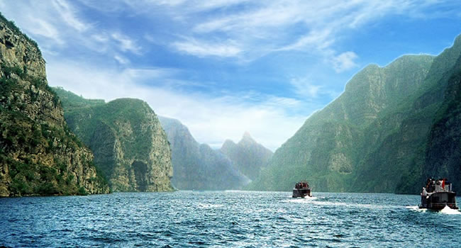 黃河三峽是小浪底與王屋山所孕育的精華,位于小浪底水庫大壩上游20公里處,總面積40平方公里, 是小浪底風(fēng)景區(qū)的精華所在。八里胡同位于黃河中下游最窄處,兩岸斷壁如削,中間河水奔涌,三條峽谷各具風(fēng)采:孤山峽鬼斧神工,千仞壁立;龍鳳峽盤龍走蛇,曲折迂回;大峪峽開闊舒展,氣象萬千。特別是九蹬蓮花棧,九蹬九級,次第升高,望之若蓮花盛開,似出水芙蓉,號稱“鯀山禹斧”。是我國北方少有的山水景觀,可以和長江三峽媲美。