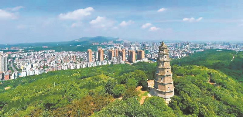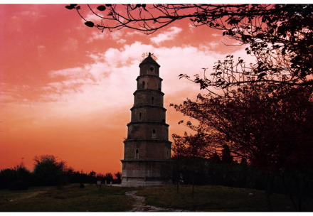 東寶塔是荊門今存的唯一一處具有千年歷史的地面文物,建于隋開皇十三年(公元593年)。寶塔通高33.3米,底部周長(zhǎng)30.6米,七層四面八角,隔面設(shè)窗,攢尖式塔頂。塔基座周長(zhǎng)31.2米,高0.76米;隙加惺殢涀,須彌座八角各雕一尊托塔金剛。底層門楣有石刻“長(zhǎng)林頭角”四字,自底層有螺旋狀青石階梯上塔頂(海拔260米)。