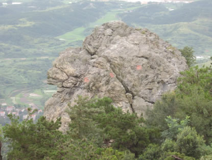 棋盤石:位于木蘭山山脊,在木蘭山風景區(qū)售票處北偏西413米處,是一處已因構成作用而松動的巨大變基火山巖(綠片巖)巖塊,石頭有一條寬約0.8米的拉張裂縫,險竣異常。棋盤石形成的地質年代為距今7.5--8億年的新元古代,那條裂縫的形成,則是與新構造活動有關。