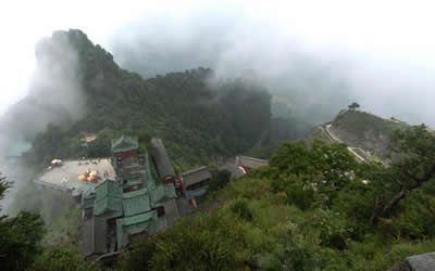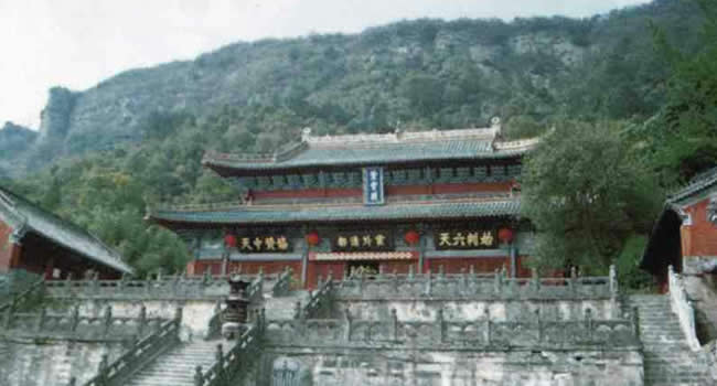 紫霄宮:建于明永樂十一年(公元1413年),原建宮殿、廊廡、齋堂、亭臺等860多間,賜額“太元紫霄 宮”。紫霄宮背依展旗峰;面對照壁、三臺、五老、蠟燭、落帽、香爐諸峰;右為雷神洞;左為禹跡池、寶珠峰。周圍山巒天然形成一把二龍戲珠的寶椅,明永樂皇帝封之為“紫霄福地”。