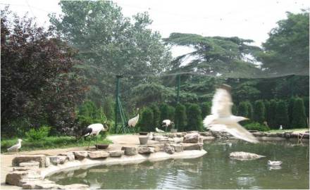 鶴園于1999年建成,面積600余平方米。2006年將原網(wǎng)罩改為不銹鋼網(wǎng)棚。該園采用不銹鋼網(wǎng)架構(gòu),配以豐富的植物,動物表現(xiàn)自然,參觀視覺通透。展出動物有丹頂鶴、白鸛、白鹮、銀鷗等。
