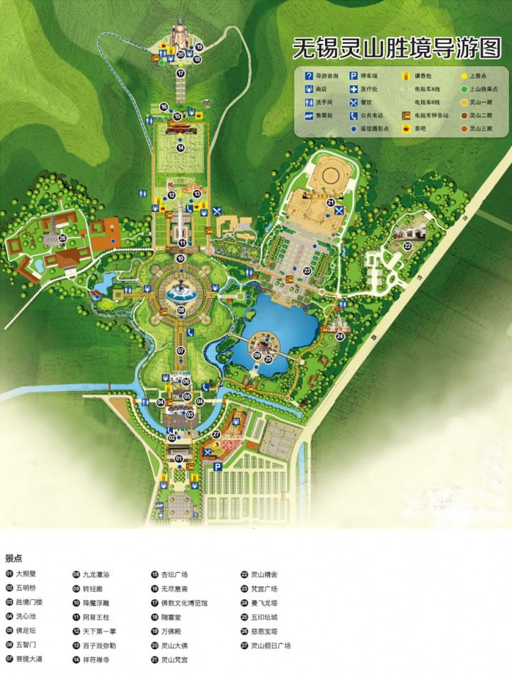 從杏壇廣場往上,攀218級登云道,看六角古井,觀七級浮雕,于大佛基座游覽靈山佛教文化博覽館。博覽館以神州五方五佛、中華四大佛山、藏傳、南傳、漢傳三大佛教語系以及佛教丈化藝術為展覽主線,充分展示博大精深的佛教文化。自博覽館乘電梯而上,游客還可參與“平安抱佛腳”活動,登高望遠,憑欄臨風,近可觀景區(qū)全景,遠可觀太湖湖光山色。從大佛足部步行而下,可參觀靈山萬佛殿。靈山萬佛殿供奉著近萬尊靈山大佛之真身小佛像,供游人瞻拜迎請。2000年靈山景區(qū)新增兩處精彩景點。大型青銅浮雕“百子戲彌勒”喜慶吉祥,深受游客喜愛。位于大佛腳下二層的靈山隨喜堂是靈山的又一處綜合展示佛教丈化的神圣殿堂,將令您嘆為觀止,并有品種多樣的佛教工藝禮品給您選購。