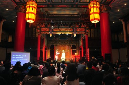民俗茶社:民俗茶社是一座全木結(jié)構(gòu)仿古茶社,精湛地展現(xiàn)了非物質(zhì)文化遺產(chǎn)項(xiàng)目——香山幫傳統(tǒng)建筑營(yíng)造技藝。茶社完全按照老式茶社布局修建,天井蘇式彩畫(huà)艷麗奪目,戲臺(tái)金碧輝煌,木雕隔斷精致巧妙,池心敞亮寬闊,包廂整肅典雅,是觀眾欣賞江蘇省表演類非遺項(xiàng)目和品味江蘇省飲食技藝類非遺項(xiàng)目的最佳場(chǎng)所,是“動(dòng)態(tài)”展示非物質(zhì)文化遺產(chǎn)的文化空間。在這里,將定期上演江蘇特有的曲藝、傳統(tǒng)戲劇折子戲和民間音樂(lè)等項(xiàng)目,如蘇州評(píng)彈、南京白局、昆曲折子戲、江南絲竹等等;并采用傳統(tǒng)茶館中“葷茶館”的形式;把南京雨花茶、蘇州洞庭碧螺春、連云港云霧茶等進(jìn)入非遺名錄的茶飲和其他飲食項(xiàng)目同時(shí)納入其中。演出時(shí)間為每天下午14:30—15:30,具體演出項(xiàng)目請(qǐng)關(guān)注屏幕導(dǎo)覽和南博網(wǎng)站。