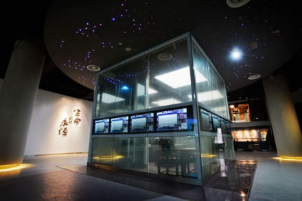 數(shù)字館位于民國(guó)館北側(cè)地下,由實(shí)體展館和網(wǎng)絡(luò)虛擬館構(gòu)成。實(shí)體館約1200平方米,用抽象概念輔以歷史事實(shí)的表現(xiàn)方式詮釋中華文明發(fā)展歷程,總體風(fēng)格時(shí)尚亮麗。突破“以展柜和展板為主”的傳統(tǒng)展陳方式,采取“不封死、不看穿”錯(cuò)層交疊的空間構(gòu)建手段,集合分列式多屏幕、透明屏、二維碼等多媒體形式,運(yùn)用實(shí)時(shí)摳像、動(dòng)作捕捉等數(shù)字技術(shù),將空間、裝飾、媒體硬件及數(shù)字內(nèi)容結(jié)合起來(lái),營(yíng)造立體豐富的展示環(huán)境,引導(dǎo)觀眾沿著流線移步換景。網(wǎng)絡(luò)虛擬館通過(guò)網(wǎng)絡(luò)和圖像識(shí)別技術(shù)復(fù)原實(shí)體展館的空間和內(nèi)容,是實(shí)體展館的延伸。以網(wǎng)絡(luò)為平臺(tái),觀眾自己制作的展示內(nèi)容,通過(guò)遴選的,也可推送到實(shí)體展館。實(shí)體展館分為六大展區(qū),序廳:以《時(shí)光》為題,通過(guò)流水、風(fēng)沙、變幻的星空,體現(xiàn)“時(shí)間”對(duì)于人類文明的獨(dú)特作用,營(yíng)造時(shí)間飛逝,萬(wàn)物滄桑的情境感。萌動(dòng)與發(fā)軔:用獨(dú)具風(fēng)格的影像勾勒出初生的人類試圖征服自然時(shí)表現(xiàn)出的勇氣與“傻氣”。進(jìn)取與成長(zhǎng):體現(xiàn)中華文明的快速發(fā)展。用歷史故事表現(xiàn)“熱血青年”、“因?yàn)閻?ài)情”、“君子愛(ài)財(cái)”、“意氣風(fēng)發(fā)”等人生路上的喜怒哀樂(lè)。擴(kuò)張與融合:用立面寬12.5m,高5.9m的C形巨幕影片,以戰(zhàn)爭(zhēng)、帝國(guó)故事表現(xiàn)人類進(jìn)步過(guò)程中的豪邁激越、堅(jiān)韌不拔以及全盛時(shí)期的聲色犬馬、宗教宣揚(yáng)。封閉與開(kāi)放:截取閉關(guān)鎖國(guó)、鴉片戰(zhàn)爭(zhēng)、文明絲路中的歷史片段,表現(xiàn)中華文明從開(kāi)拓進(jìn)取逐漸轉(zhuǎn)向內(nèi)斂、保守、固步自封的心態(tài)。生命因你永恒:總結(jié)在初生、發(fā)展、強(qiáng)盛、衰落這一螺旋式漸進(jìn)的歷史進(jìn)程中,文化和民族產(chǎn)生了融合,政治制度、科學(xué)技術(shù)和文化藝術(shù)也在不斷成熟、進(jìn)步,文明向更加美好和睿智的方向前進(jìn)。