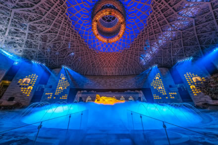 禪境大觀,南北長112米,東西寬62米,內(nèi)部凈高約41.2米,涵蓋了地上三層。整個(gè)空間面積超過6000㎡,呈橢圓形,以黃、白、灰三色為基調(diào),布置出人間山水,從而讓人們在行走之際領(lǐng)略禪意。由佛陀出生、成道的禪境花園及中間的如蓮劇場三個(gè)部分組成,展現(xiàn)了佛祖一生的行跡。