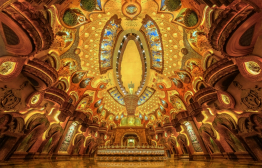作為佛頂圣境區(qū)的核心之一,佛頂宮坐落于牛首山西峰之處,建基于歷史遺留礦坑之上,總建筑面積約13.6萬平方米,與佛頂塔共同構(gòu)成牛首西峰新景象,與牛首東峰遙相呼應(yīng),再現(xiàn)牛首“雙峰雙闕”并峙的宏偉盛景。整個(gè)佛頂宮以佛祖頂骨舍利供奉為主題,外部分為大穹頂和小穹頂兩個(gè)部分,寓意外供養(yǎng)和內(nèi)供養(yǎng)。大穹頂形如佛祖袈裟覆蓋在小穹頂之上,象征著佛祖的無量加持;小穹頂下部為蓮花寶座造型,上部為摩尼寶珠造型,上下結(jié)合形成“蓮花托珍寶”的神圣意象。
