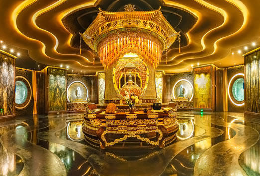 舍利藏宮又稱佛寶層,整體以暗色調(diào)為主,營造出莊重的氛圍。由三廳一廊、藏宮大殿(舍利寶幢、拼畫、四大菩薩)、參拜環(huán)廊三部分組成。這里既是珍藏佛祖頂骨舍利的神圣之地,又是信眾禮佛參拜、靜坐禪修的神秘空間。長廊長66米,根據(jù)六波羅密的供養(yǎng)內(nèi)涵,即持戒、布施、忍辱、精進(jìn)、禪定、智慧布局,分別是香供廳、燈供廳、水供廳以及花供長廊。
