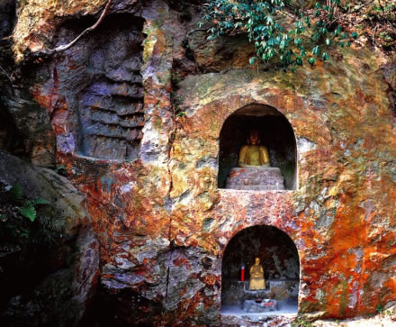明代摩崖石刻,位于牛首山東峰兜率巖北崖,距弘覺寺塔約一百米。崖壁上共開鑿5個(gè)佛龕,北壁3個(gè),東壁2個(gè),共有133尊雕像。石刻整體呈“幾”字形,三面巖石南北長11.5米,東西寬5.8一8米,中間圍合成約77平方米的平地空間,正窟面對祖堂山主峰獻(xiàn)花巖。石刻包括佛像、題刻。5座佛龕內(nèi)每座佛龕所雕數(shù)目不等。在石壁正中一龕里,僅雕釋迦牟尼像,高1.78米,結(jié)跏趺壘,施禪定印,下為高0.39米仰覆蓮須彌座,雕刻較為粗糙。在龕外左右兩壁上刻有記載牛首山“敕賜弘覺禪寺”所屬范圍的文字。距該龕東西兩側(cè)約3米處各有一龕,東龕上下九層共75尊,最下層為環(huán)立武僧。上面皆為盤膝打坐的修士,但絕大多數(shù)已有損毀。西龕則雕鑿在“幾”字形的側(cè)壁上,其內(nèi)容、風(fēng)格與東龕相同。在西龕的下部相距高約0.39米處,另有一小龕,內(nèi)鑿高0.45米的彌勒像一尊,藝術(shù)造詣較高于其他諸像,且龕外石壁右側(cè)刻有“大明成化元年歲次乙酉五月五日口口真定成造彌勒佛一尊永遠(yuǎn)供養(yǎng)”的題記。佛龕兩側(cè)尚刻有四處梵文,其東壁南側(cè)的巖石上,鐫一行梵文,寬約1.6米,另有《題感應(yīng)泉詩》一首,詩系刻在石壁上,長0.5米,寬0.32米,每字約4厘米,有11行,滿行8字,共83字,除去4字已剝蝕外,其余79字清晰可辨。