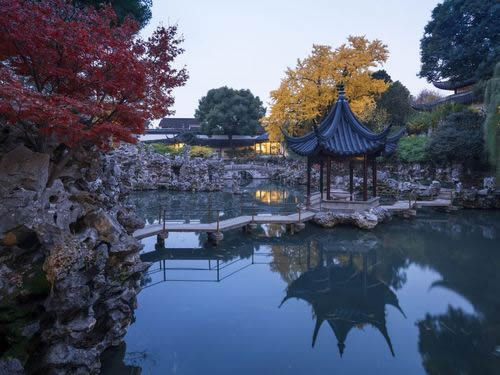 園內(nèi)水體聚中有分。聚合型的主體水池中心有亭佇立,曲橋連亭。在園西假山深處,山石做懸崖狀。一股清泉經(jīng)湖石三疊,奔瀉而下,形成了蘇州古典園林引人注目的人造瀑布。園中水景豐富,溪澗泉流,迂回于洞壑峰巒之間,隱約于林木之中,藏尾于山石洞穴。