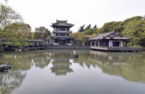 春秋閣東南下,有面闊五間、平挑入水、半架河上、前設(shè)半亭的水榭。延伸處有貼水平臺(tái),三面圍以欄桿,中開方洞,露出水面一方,名“問魚淵”。時(shí)見小魚悠游,伸手可掬。水榭中間,由費(fèi)新我書“層波疊影”額。水榭連廊,穿過春秋閣直通數(shù)魚檻,其中一段架于水面,故名“水旱廊”。數(shù)魚檻緊倚千步長廊,面闊七間,臨水而筑,池對(duì)面建有半亭,是從西水仙廟遷來。密密斗拱托撐飛檐之頂,古色古香。穿亭向前,有延伸入池的半島,上建六角攢尖的“綠漪亭”。 假山群在蠡園入口和“層波疊影”之間。一大片湖石堆疊而成的奇峰,嶙峋多姿,氣勢不凡。一條石徑,盤旋曲折,忽高忽低,忽寬忽狹,忽明忽暗。置身其間,聞聲不見人,可望不可即,如入迷宮。假山都以“云”字為題,有“云窩、云腳、穿云、朵云、