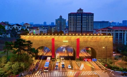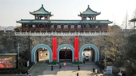 太平門位于玄武湖東南角,是南京明城墻十三座明代京城城門之一,是明朝京師應(yīng)天府京城的正北門,城門東側(cè)城墻被稱為“龍脖子”。復(fù)建后的太平門為方便交通改為三孔城門,主門洞設(shè)四股車道,兩個輔門洞各設(shè)兩股,城門寬約72米。