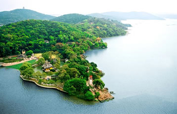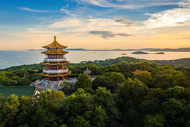 原稱三山島,位于黿頭渚西南2.6千米的湖中,有“三山映碧”譽稱。島上建有三山道院,有會仙橋、天街、靈霄宮、天都仙府、月老祠、大覺灣等建筑。玉宇瓊樓,古樂陣陣,室內(nèi)布置瑰麗雄奇,神像生動,其中玉帝塑像高達(dá)18米。