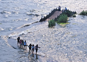 景區(qū)西部一天然水灣,建有萬浪橋和曲堤。凌波漫步,長浪拍岸,每當(dāng)湖風(fēng)吹起,水濺珠飛,恰似雪花紛飛。傍晚,又可見夕陽歸舟,漁舟夜泊之趣。側(cè)有王昆侖紀(jì)念館、萬方樓、廣福寺、陶朱閣等名勝古跡。