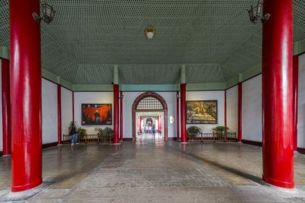 總統(tǒng)府建筑群的主軸線,由門樓、大堂、二堂、八字廳、會(huì)客廳、麒麟門、政務(wù)局樓、子超樓組成。建筑風(fēng)格前半部分以中式為主,后半部分則以西式居多。