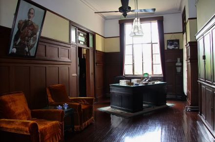 總統(tǒng)辦公室位于總統(tǒng)辦公樓(子超樓)二層的東南角,是一個(gè)由三個(gè)房間組成的套房,曾是蔣介石的辦公室。中間的一間為辦公室,臨窗有一巨形寫字臺(tái),寫字臺(tái)上有一本臺(tái)歷,臺(tái)歷的日期仍然是1949年4月23日,這天是南京的解放日,歷史在這里定格。一張?zhí)刂频钠まD(zhuǎn)椅,會(huì)客用的沙發(fā)上方懸掛著蔣介石身穿戎裝的巨幅照片,四周的墻壁上則是嵌入墻體的文件柜,屋頂上懸掛著從法國(guó)里昂進(jìn)口的磨砂玻璃吊燈。辦公室東間為休息室,配有衛(wèi)生間。西間為書房和接待室。