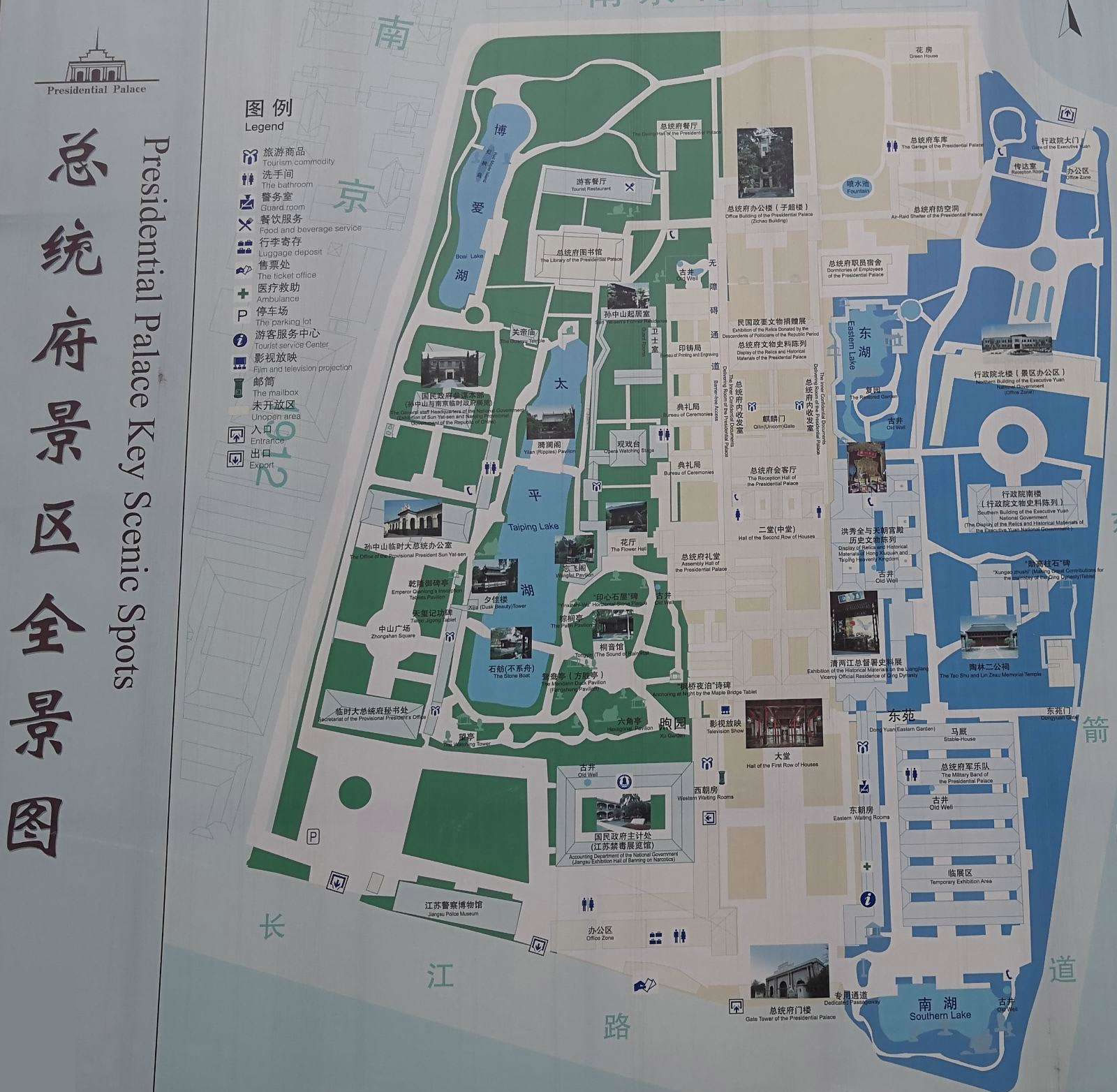 總統(tǒng)府(中國(guó)近代史博物館)占地面積9萬(wàn)平方米,共分三個(gè)參觀區(qū)域。中區(qū)(中軸線)主要是國(guó)民政府、總統(tǒng)府及所屬機(jī)構(gòu);西區(qū)是孫中山的臨時(shí)大總統(tǒng)辦公室、秘書處和西花園,以及參謀本部等;東區(qū)主要是行政院舊址、馬廄和東花園。一系列展館和史料陳列,則分布在這三個(gè)區(qū)域中。