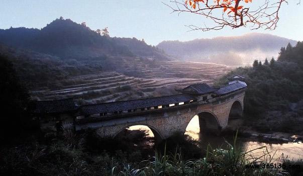 玉帶橋:因其弧形如玉帶,故名。玉帶橋?yàn)楫?dāng)?shù)馗晃逃囡L(fēng)歧募資建于清乾隆五年(公元1740年),又名“風(fēng)歧橋”。玉帶橋?yàn)槎杖孜輼鞘焦皹,橋身成弧行,橋長(zhǎng)88.15米,是江南現(xiàn)存最長(zhǎng)的弧形廊橋,它以結(jié)構(gòu)獨(dú)特,氣勢(shì)雄偉而聞名贛粵。留下了“遠(yuǎn)近聞名玉帶橋,兩岸峻峰入云霄。奔騰河水瀉千里,玉帶飛鎮(zhèn)兩山腰”的贊譽(yù)。