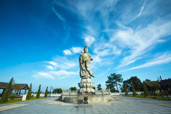 滴水觀音菩薩雕像于2007年香港回歸10周年贛粵港信眾捐建,其寶相慈祥莊嚴(yán),左手持凈瓶,右手做法印,屹立在三百山東江的源頭。雕像總高11.69米,與主峰海拔相稱。雕像的形態(tài)、手法符合佛教的意義,具備當(dāng)今美學(xué)、建筑學(xué)、雕塑學(xué)、佛像藝術(shù)的時(shí)代特色。
