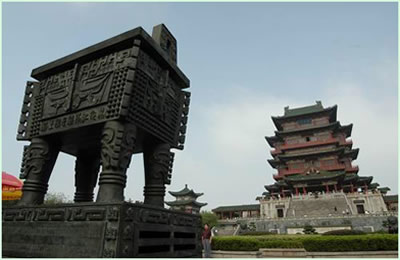 下部為三足古鼎,上部是一座攢尖寶頂圓亭式鼎蓋。此鼎乃仿北京大鐘寺“八怪”鼎而造。此鼎之設(shè),寓有金石永固之意。