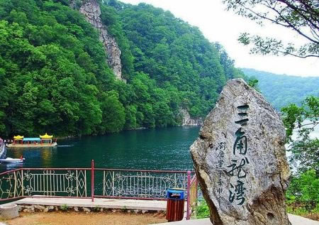 三角龍灣又名黑龍?zhí)叮瑐髡f(shuō)有一條三只角的黑龍距此修煉,經(jīng)常行云布雨,除惡降魔,普濟(jì)四方百姓,后來(lái)黑龍飛往長(zhǎng)白山天池,龍去留淵,留有一灣圣水。位于輝南城朝陽(yáng)鎮(zhèn)東南45公里處的高山密林之中。系古代火山噴發(fā)口積水而成,因水面呈三角形,加之湖南側(cè)矗立著30米高的三角石,故名“三角龍灣”。是進(jìn)入長(zhǎng)白山的門戶之一。這里自古以來(lái)風(fēng)光秀美,景色迷人。我國(guó)著名第二大火山群—龍崗火山群就分布在這里。