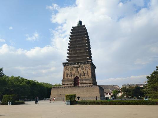 朝陽(yáng)南塔青磚砌筑,方形空心十三級(jí)密檐式,原存高45米,現(xiàn)經(jīng)修繕,標(biāo)高56米。方形磚基座,座上為須彌座,下部?jī)蓪邮,?nèi)設(shè)壺門,磚雕云龍和蓮花;上部有仰蓮座承托塔身。塔身南面中央辟券門,上雕華蓋,內(nèi)通塔心室,其他三面中部設(shè)假門,門棚飾卷云紋,上垂華蓋。塔身上部每側(cè)各嵌石質(zhì)塔銘兩塊。