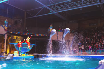 2、《海豚灣之戀》表演——圣亞“三大表演”之一,海豚、白鯨、美人魚、王子、海盜、月光天使共同主演,情節(jié)跌宕起伏,風(fēng)格浪漫唯美。表演地點(diǎn):夢幻海豚灣。表演時長:20分鐘左右(旺季表演前10分鐘有外國小丑互動)。