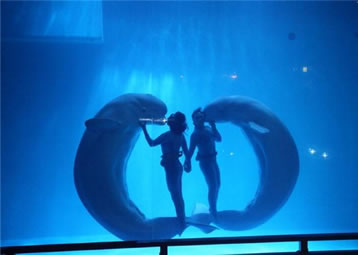 表演地點(diǎn):白鯨水下表演場(開放式表演場,無表演時游客可透過玻璃展窗看白鯨游動)。
