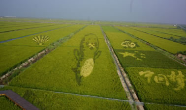 稻田作畫,又稱稻田彩繪,主要是以黃色、綠色和紫色葉水稻種植于水田中,栽種時先在農(nóng)田里用傳統(tǒng)畫線器,畫出九宮格,依圖樣定出坐標(biāo),再牽線繪出圖樣或字體輪廓,最后種上黃色秧苗,隨著水稻生長,就會呈現(xiàn)出預(yù)先規(guī)劃的圖形或文字。在不同的位置栽種不同的稻米品種,通過精細巧妙的排列組合,不同顏色葉子的稻米會在生長過程中自然鋪陳出一幅幅美麗的圖畫。稻田彩繪可以維持兩個半月左右。