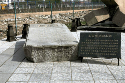 奉天忠靈祠石碑:日本帝國主義先后在沈陽建立了“日俄奉天大會戰(zhàn)紀念碑”和“靖國神社奉天分社忠靈祠、忠靈塔、忠靈碑”,用來埋葬侵華日軍在日俄戰(zhàn)爭至“九·一八”事變期間戰(zhàn)死者的36400多個將士的遺骨。