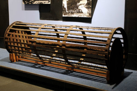 滾地籠刑具:這件黑色的鐵制滾地籠刑具,就是日偽時期被用于迫害抗日反滿志士及廣大無辜群眾的刑具。它縱66厘米,橫200厘米,呈圓柱形,中空,籠內(nèi)壁鑲滿鋒利的釘刺,釘尖向內(nèi),側(cè)面為鐵皮蓋,可打開。 該刑具原存于沈陽階級教育展覽館,后由遼寧近現(xiàn)代歷史博物館收藏,1998年,調(diào)撥給“九·一八”事變紀念館擴建辦,1999年9月18日轉(zhuǎn)入“九·一八”歷史博物館收藏。