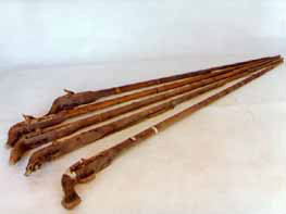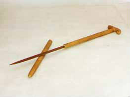 拐杖刀:俗稱“二人奪”,長約90厘米。表面上看呈拐杖型,木質(zhì)。但實際上,其前面是可以斷開的,拔出外鞘,里面是一個刺刀。這是抗日斗爭初期,東滿游擊隊和當?shù)厝罕娪脕韺Ω稊橙说拿孛芪淦。是當時很流行很實用的武器。