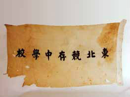 東北競存中學校旗:這面校旗,雖然多處損破,但這面旗幟是人民宣傳和進行抗日救亡活動的光輝旗幟。