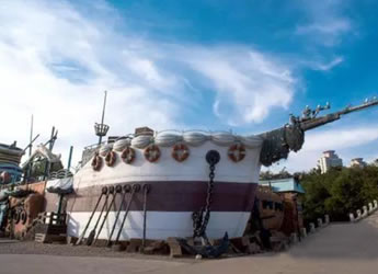海盜村以海盜和海盜景物的卡通造型,對(duì)所有建筑,游樂設(shè)施、休閑場(chǎng)所,景觀進(jìn)行包裝。一期工程中的海盜船,是國內(nèi)僅有的架設(shè)在海灣海平面上的海盜船。它的支點(diǎn)高13.5米,最大擺角120度,每船可以乘游客40人。