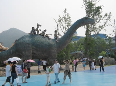 侏羅紀(jì)激流探險(xiǎn),總占地面積8600平方米,以一種時(shí)空穿插的景觀設(shè)計(jì)手法,將五種八只侏羅紀(jì)時(shí)期的恐龍置身于虛幻的遠(yuǎn)古村落中。載客古船,沿210米長(zhǎng),15米高的水道激流急下,沿途中,一只高9米,長(zhǎng)19.8米,重約8噸的亞洲最大的機(jī)械恐龍“巨無霸”,不時(shí)的向沖刺在激流中的游人搖頭擺尾,吼叫或噴水,載客古船激起的25米高的巨浪。 旅游船