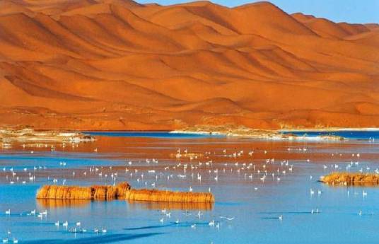 當(dāng)?shù)啬撩穹Q之為“月亮湖”、“中國湖”,因?yàn)樵摵䦶臇|邊看好像一輪彎彎的月亮靜靜地傾訴著古老的故事,從西邊沙丘上看好像一幅中國地圖,氣勢磅礴。