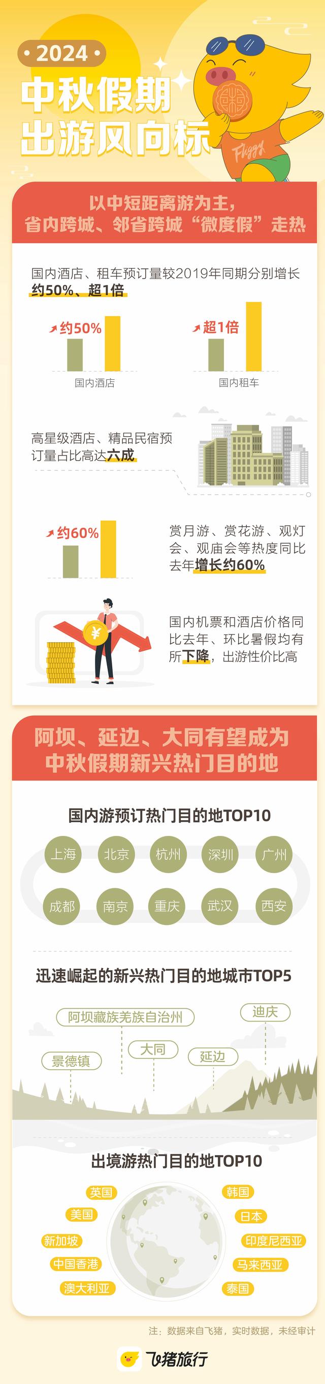 飛豬數(shù)據(jù)顯示,截至目前中秋假期國內(nèi)酒店預(yù)訂量較2019年同期增長約50%,其中高星級酒店、精品民宿預(yù)訂量占比高達六成。江浙滬、廣深珠、京津、川渝都市圈內(nèi)的特色酒店、民宿和度假村,該特征更為明顯。